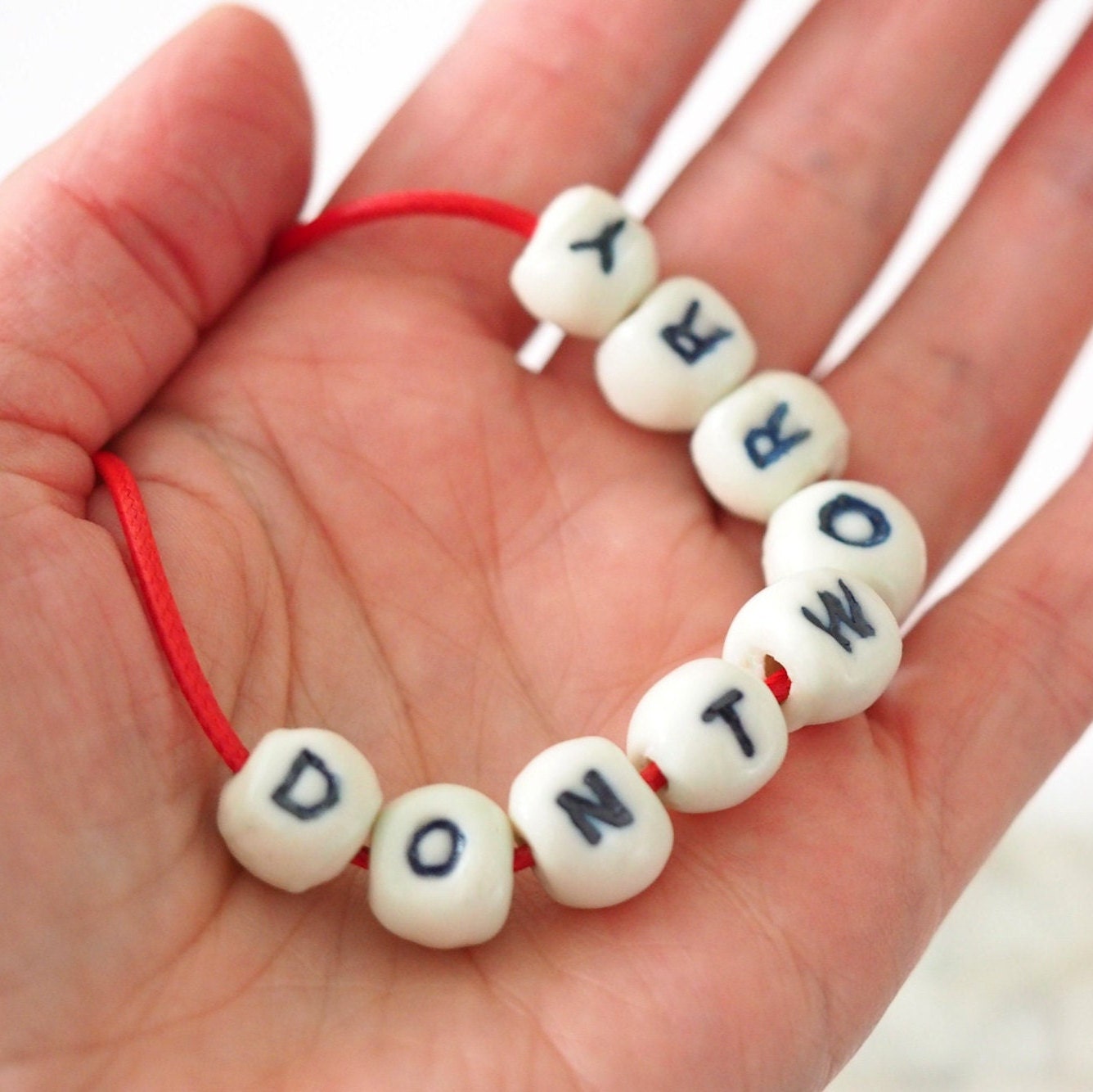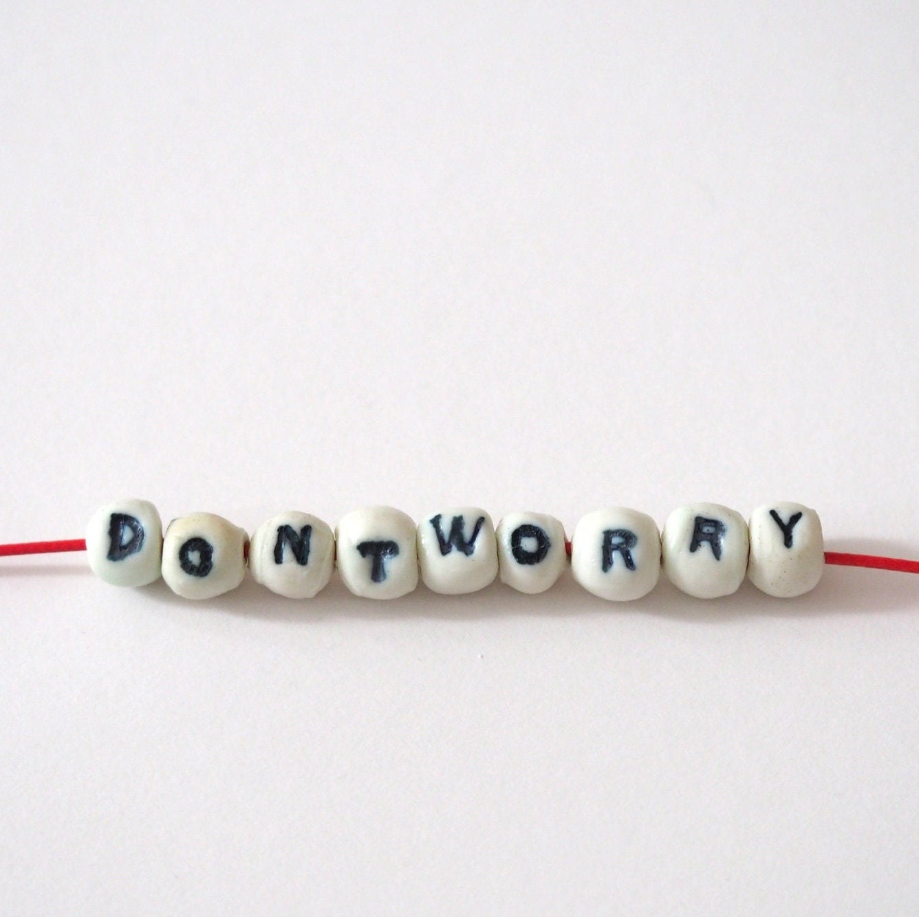 A set of 9 handmade porcelain "DONT WORRY" beads.