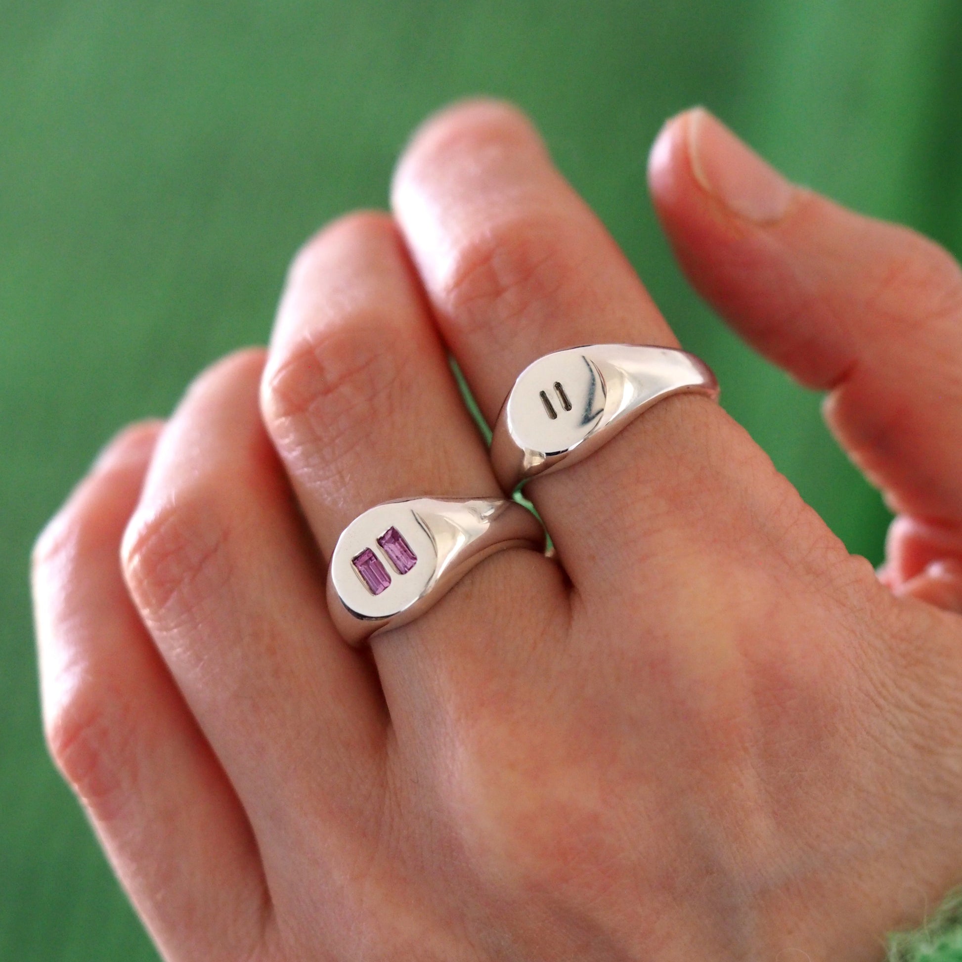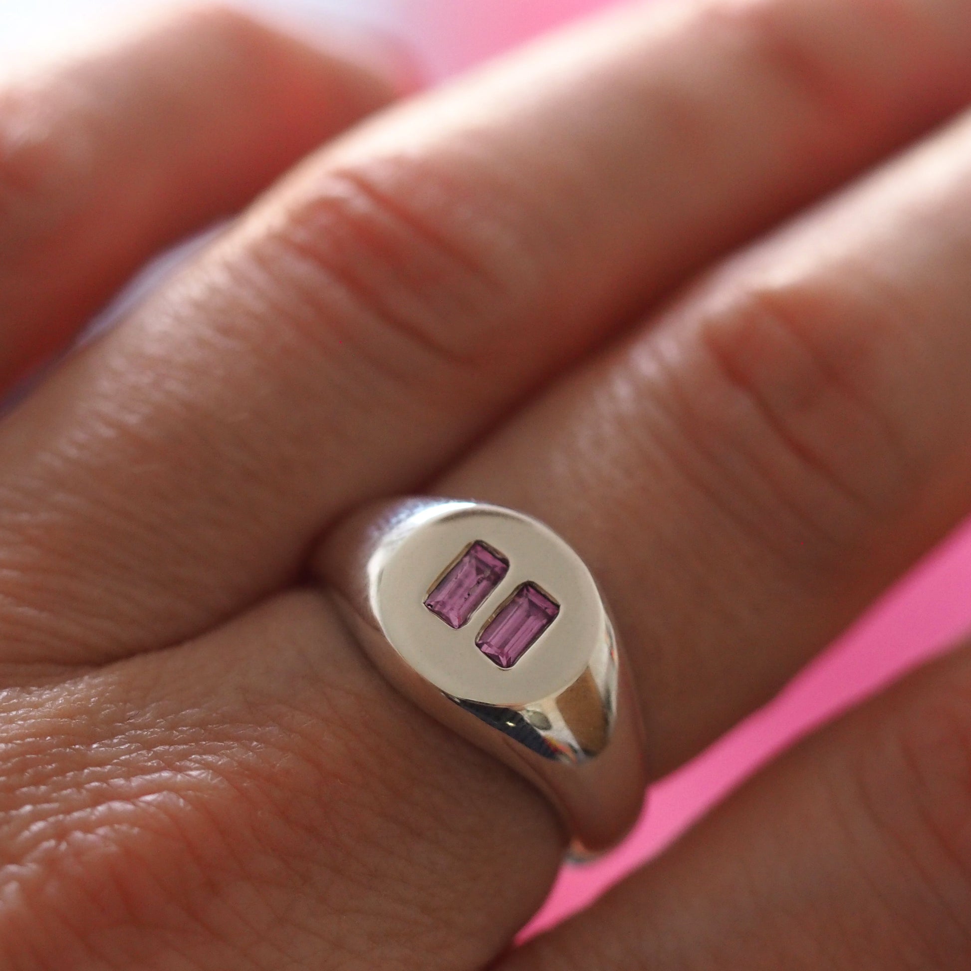 Stones are baguette cut high gem quality pink sapphires. We can use different stones to order - this can change the price of the ring.